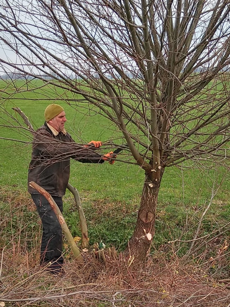 van de werkploeg ging in de uiterwaarden bij Rha de wilgen van de familie Lamers knotten;